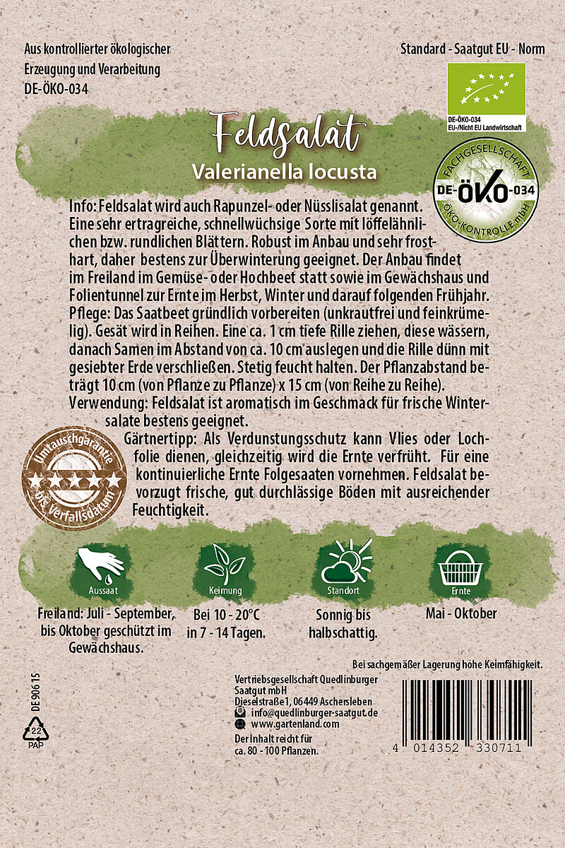 Info: Feldsalat wird auch Rapunzel- oder Nüsslisalat genannt. Eine sehr ertragreiche, schnellwüchsige Sorte mit löffelähnlichen bzw. rundlichen Blättern. Robust im Anbau und sehr frosthart, daher bestens zur Überwinterung geeignet. Der Anbau findet im Freiland im Gemüse- oder Hochbeet statt sowie im Gewächshaus und Folientunnel zur Ernte im Herbst, Winter und darauf folgenden Frühjahr.