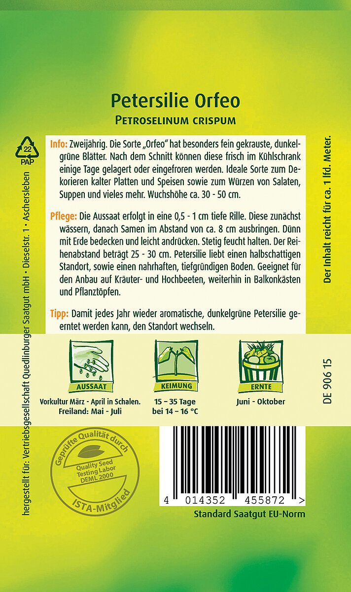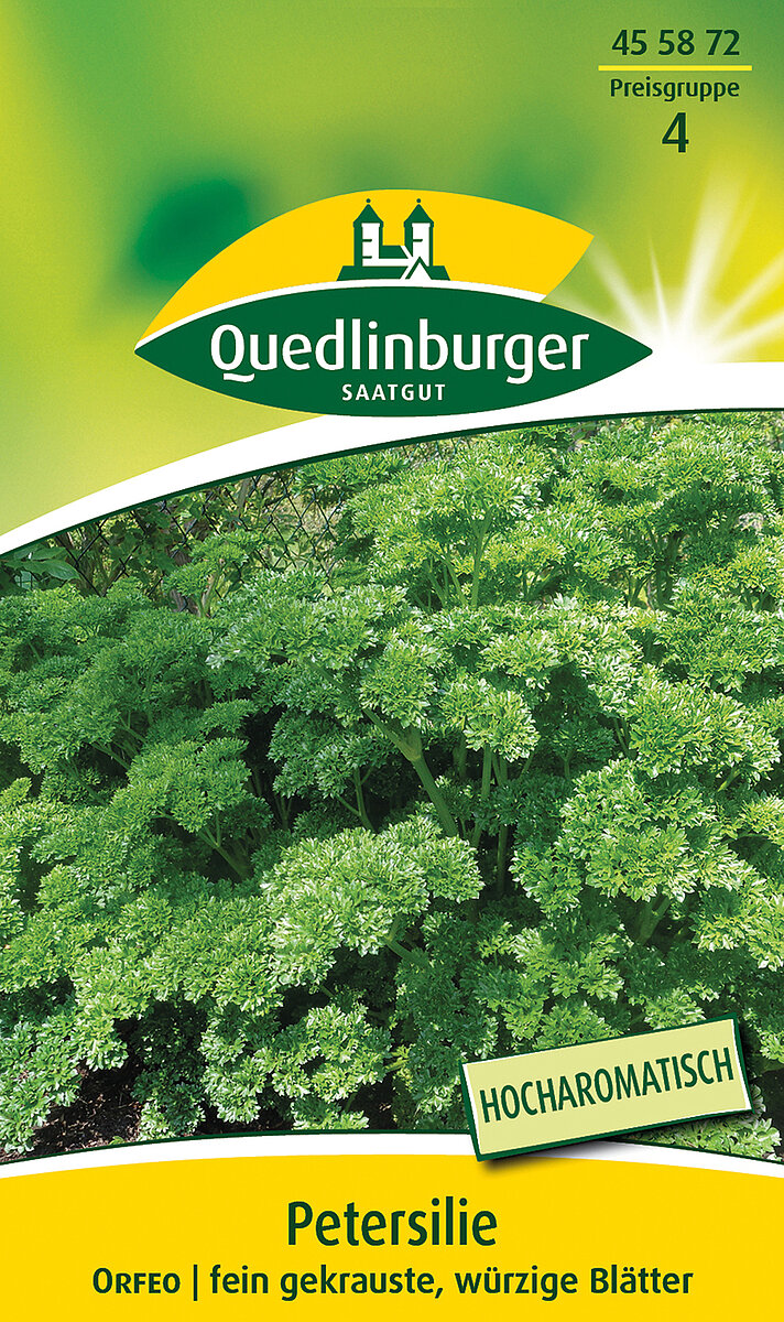 Info: Zweijährig. Die Sorte „Orfeo“ hat besonders fein gekrauste, dunkelgrüne Blätter. Nach dem Schnitt können diese frisch im Kühlschrank einige Tage gelagert oder eingefroren werden. Ideale Sorte zum Dekorieren kalter Platten und Speisen sowie zum Würzen von Salaten, Suppen und vieles mehr. Wuchshöhe ca. 30 - 50 cm.